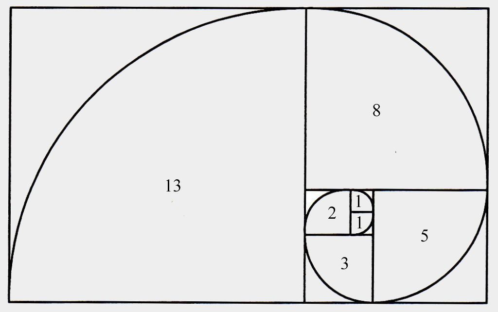 Abbildung 1:Eine perfekte Spirale, gebildet aus aneinandergrenzenden Quadraten, deren Abmessungen auf der Fibonacci-Folge basieren.