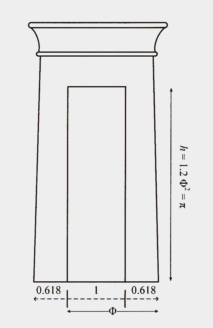 Abbildung 2: Der Goldene Schnitt F und die Kreiszahl π sind in den Abmessungen der Tore ägyptischer Tempel eingebettet.